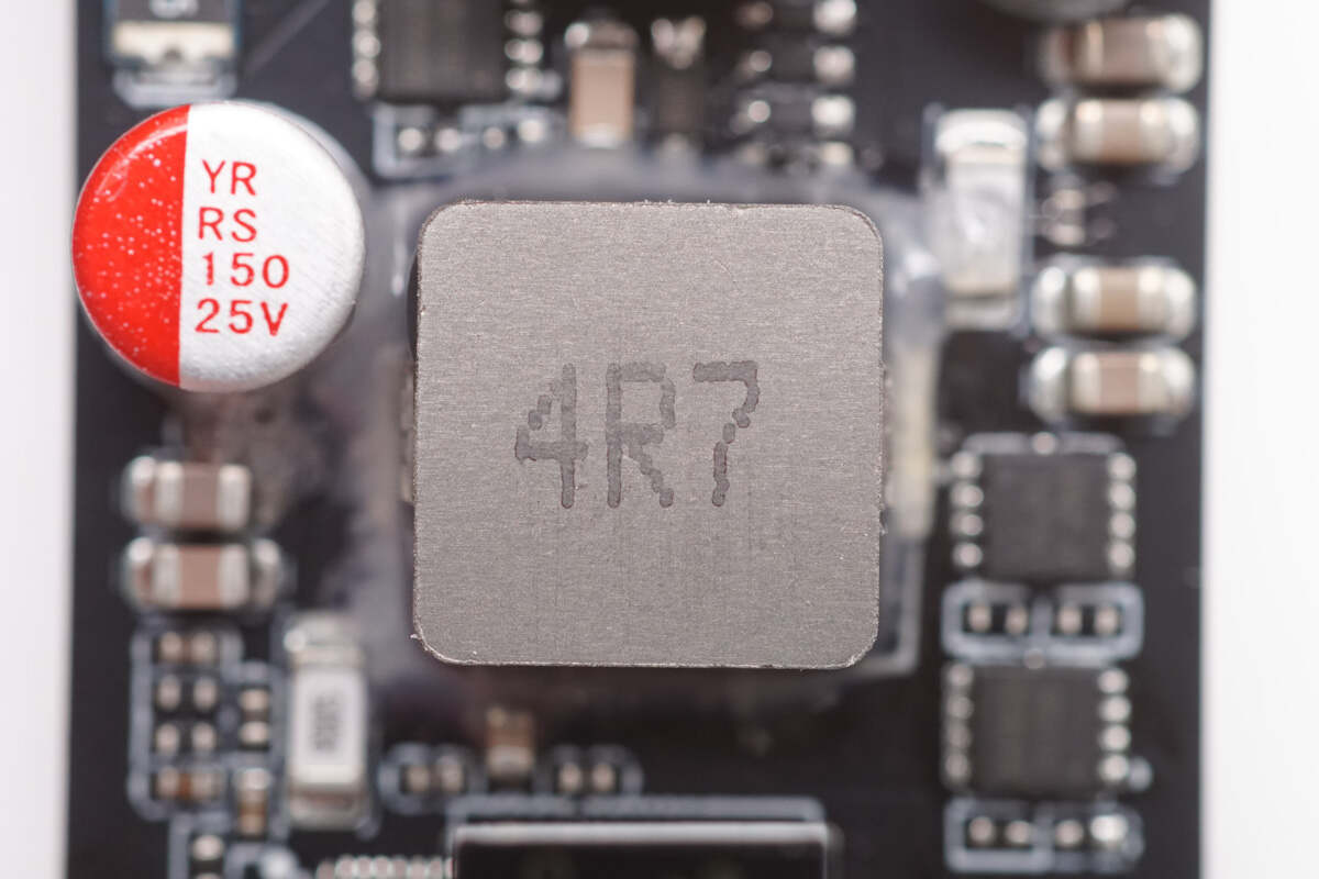 PCBA模块正面一览。中心位置是一颗4R7合金电感,用于升降压电压转换,周边打胶加固。上面焊接有VBUS开关管,电池保护管,升降压开关管、电池保护芯片以及移动电源主控芯片。