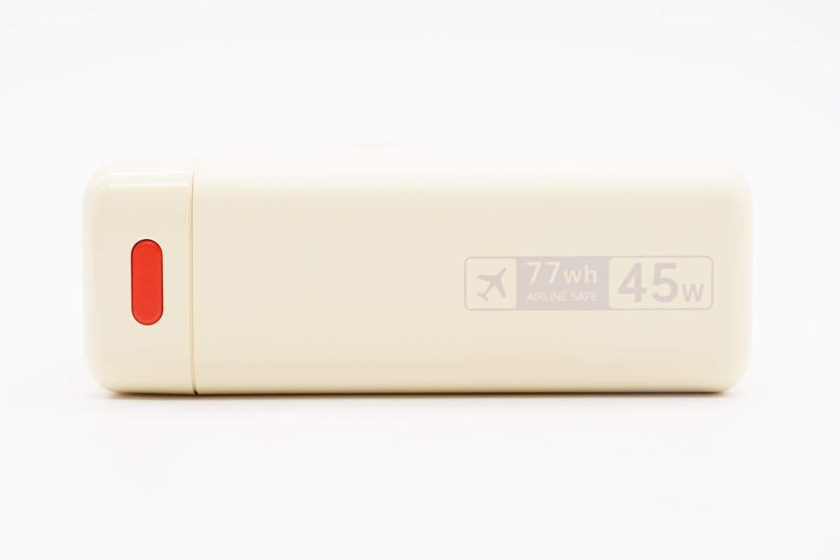 侧面拥有醒目的红色电源键,同时印有77Wh能量、45W充电功率以及可上飞机标识。