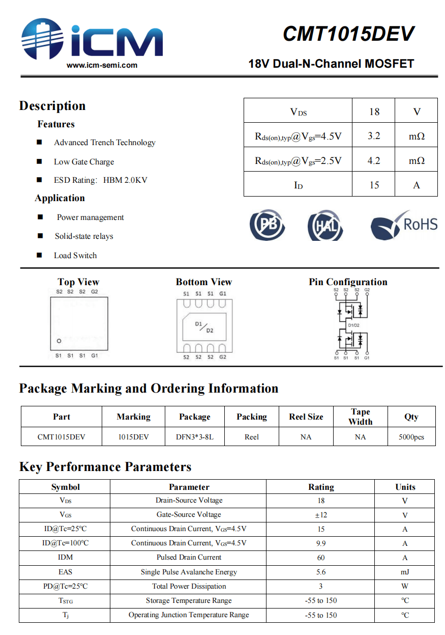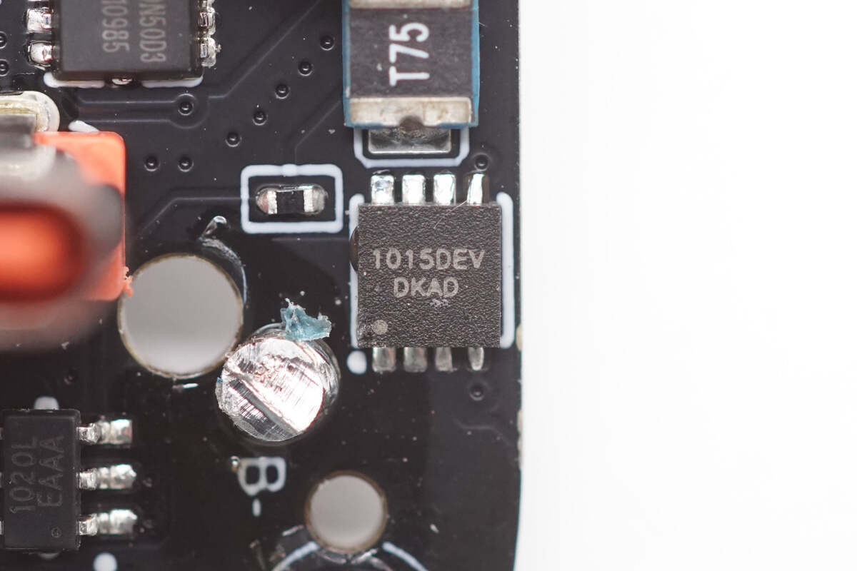 旁边的电池保护管同样来自创芯微,丝印1015DEV,实际型号CMT1015DEV,耐压18V,双NMOS管,采用DFN3*3-8L封装。