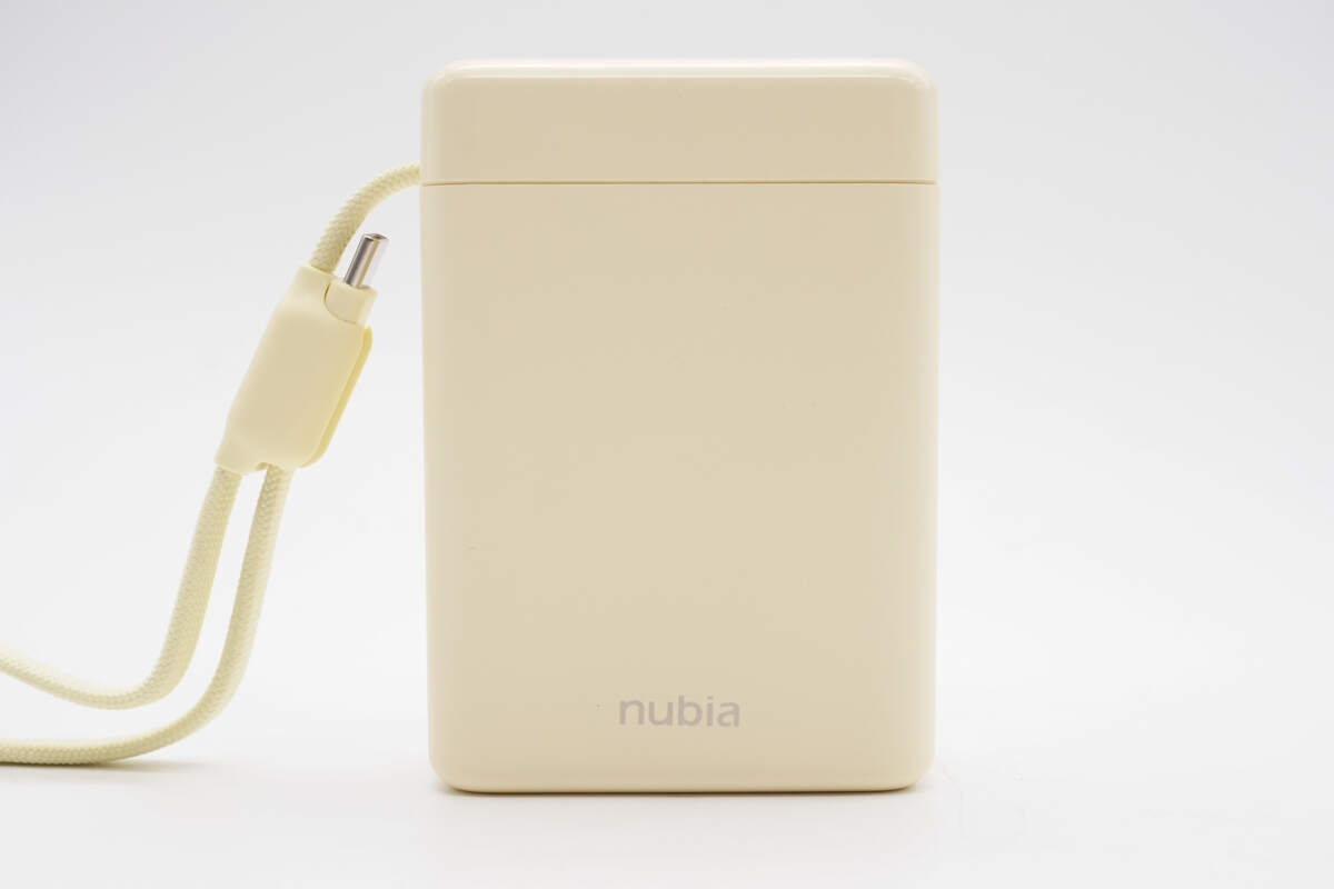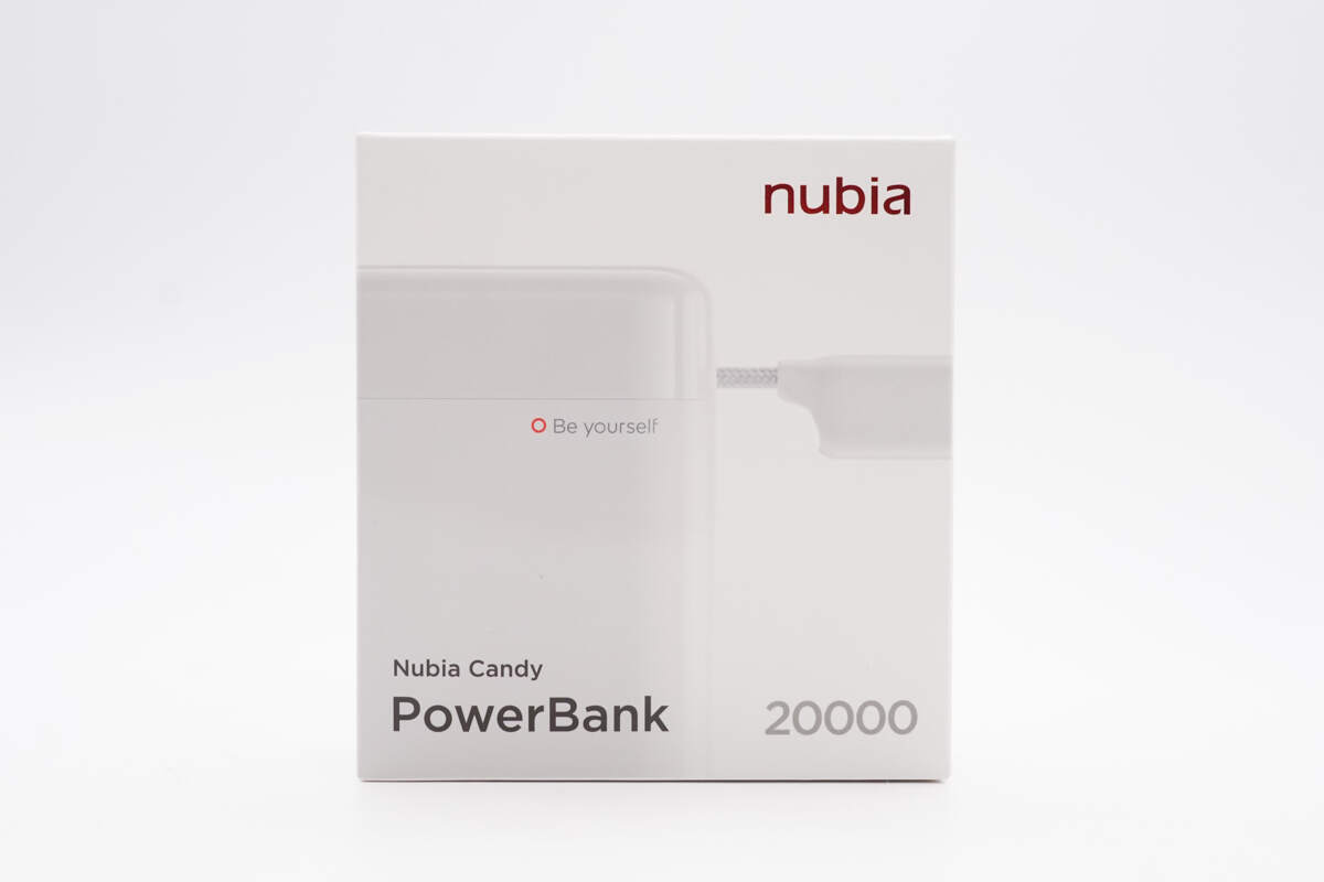 在外包装上延续了糖果系列的设计语言,正面可见移动电源缩略图,右上角为“nubia”品牌LOGO,下方为产品名称以及20000mAh容量标识。