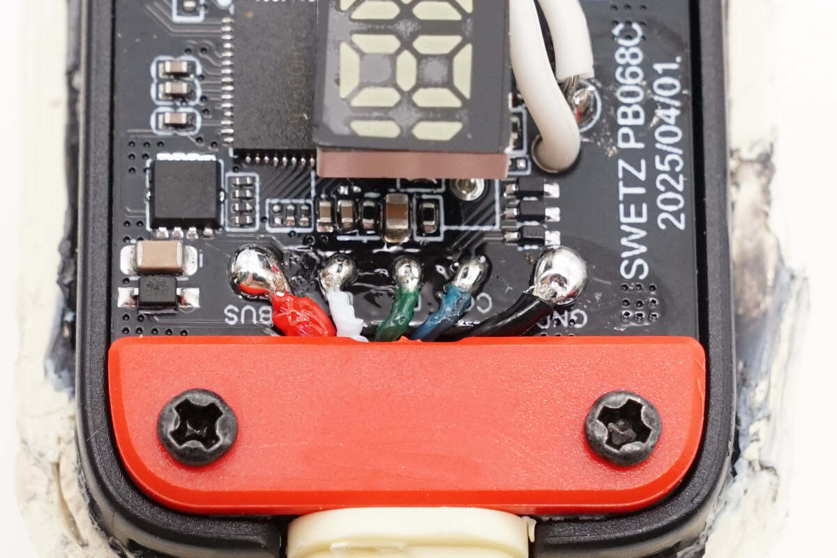 红色盖板通过两颗十字螺丝将自带线以及PCB板固定在底部。