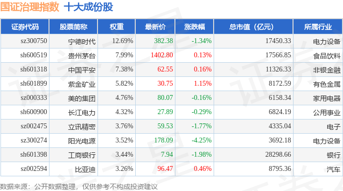 证券之星消息,12月10日,国证治理(399322)指数报收于10358.39点,跌0.56%,成交990.59亿元,换手率0.3%。当日该指数成份股中,上涨的有22家,汇川技术以3.09%的涨幅领涨,下跌的有27家,阳光电源以4.25%的跌幅领跌。