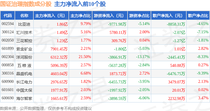 资金流向方面,国证治理(399322)指数成份股当日主力资金净流出合计73.72亿元,游资资金净流入合计21.86亿元,散户资金净流入合计51.85亿元。成份股资金流向详情见下表: