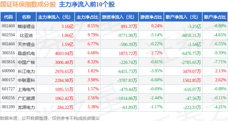 资金流向方面,国证环保(399358)指数成份股当日主力资金净流出合计31.31亿元,游资资金净流入合计6.38亿元,散户资金净流入合计24.93亿元。成份股资金流向详情见下表:
