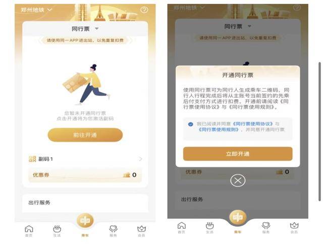 选择“前往开通”,绑定支付方式(仅支持支付宝、微信、云闪付支付方式),选择相应副码(最多支持激活4个副码),点击切换按钮,勾选《同行票使用协议》《同行票使用规则》,点击立即开通则激活同行票功能。