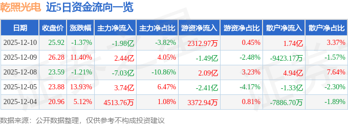 证券之星消息,截至2025年12月10日收盘,乾照光电(300102)报收于25.92元,下跌1.37%,换手率21.3%,成交量195.22万手,成交额51.72亿元。
