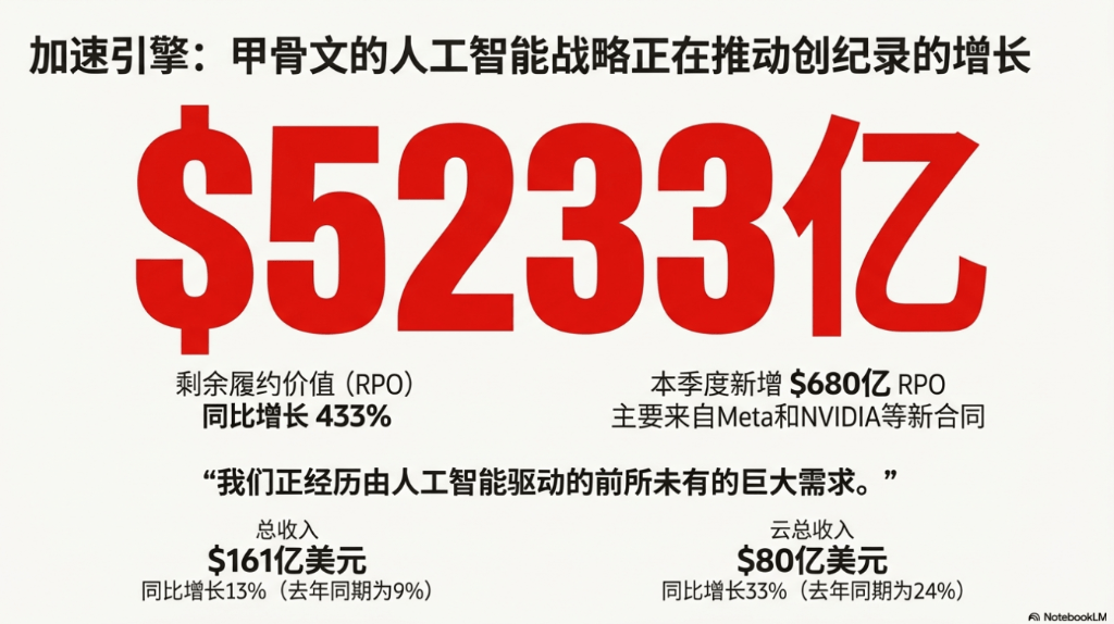 - 积压订单(RPO)爆炸式增长:RPO达到惊人的5233亿美元,同比增长433%,主要由Meta、NVIDIA等巨头的算力合同驱动。