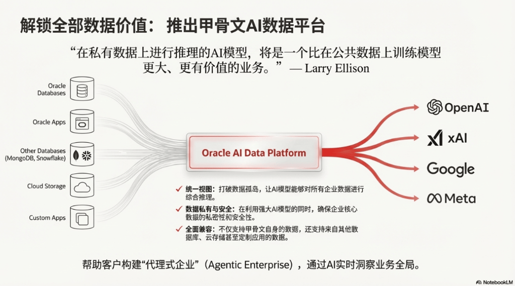 - Larry Ellison的AI终局构想:埃里森认为AI的未来在于“对私有数据进行多步推理”,并称甲骨文的AI数据平台能让大模型连接所有数据库(包括非甲骨文数据),这是打破数据孤岛的关键。