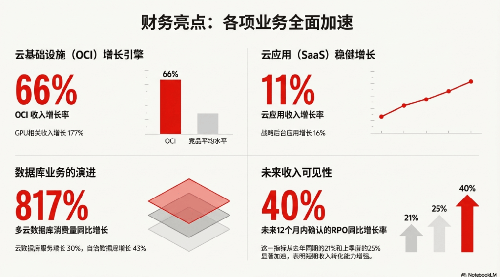 - 基础设施(OCI)增速碾压对手:IaaS收入增长66%,GPU相关收入暴增177%,并交付了9.6万颗NVIDIA GB200芯片。