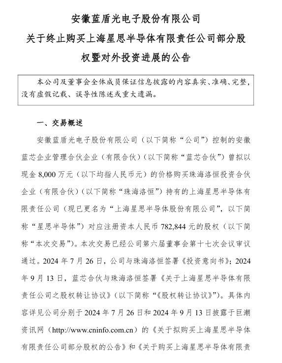 公告显示,蓝盾光电控制的安徽蓝芯企业管理合伙企业(有限合伙)(以下简称“蓝芯合伙”)原拟以现金8000万元的价格购买珠海洛恒投资合伙企业(有限合伙)(以下简称“珠海洛恒”)持有的星思半导体对应注册资本78.28万元的股权。