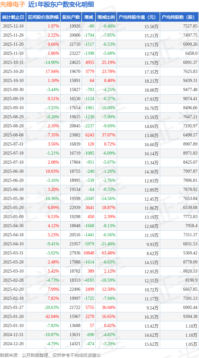 从股价来看,2025年11月28日至2025年12月10日,先锋电子区间涨幅为1.97%,在此期间股东户数减少80.0户,减幅为0.4%。