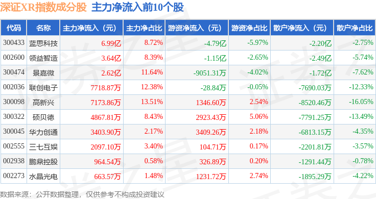 资金流向方面,深证XR(970046)指数成份股当日主力资金净流出合计27.68亿元,游资资金净流入合计3.41亿元,散户资金净流入合计24.27亿元。成份股资金流向详情见下表: