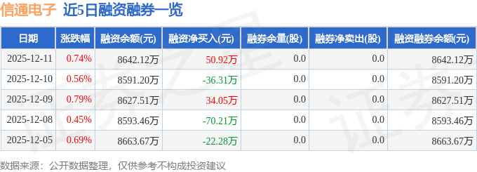 信通电子融资融券信息显示,融资方面,当日融资买入247.53万元,融资偿还196.61万元,融资净买入50.92万元。融券方面,融券卖出0.0股,融券偿还0.0股,融券余量0.0股,融券余额0.0万元。融资融券余额8642.12万元。