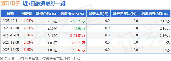 盟升电子融资融券信息显示,融资方面,当日融资买入5914.95万元,融资偿还6145.18万元,融资净偿还230.22万元。融券方面,融券卖出0.0股,融券偿还0.0股,融券余量0.0股,融券余额0.0万元。融资融券余额2.13亿元。