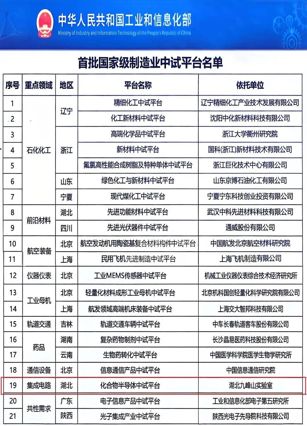 12月11日,工业和信息化部召开中试创新发展座谈会,公布首批国家级制造业中试平台名单,九峰山实验室化合物半导体中试平台是集成电路领域唯一入选的平台。