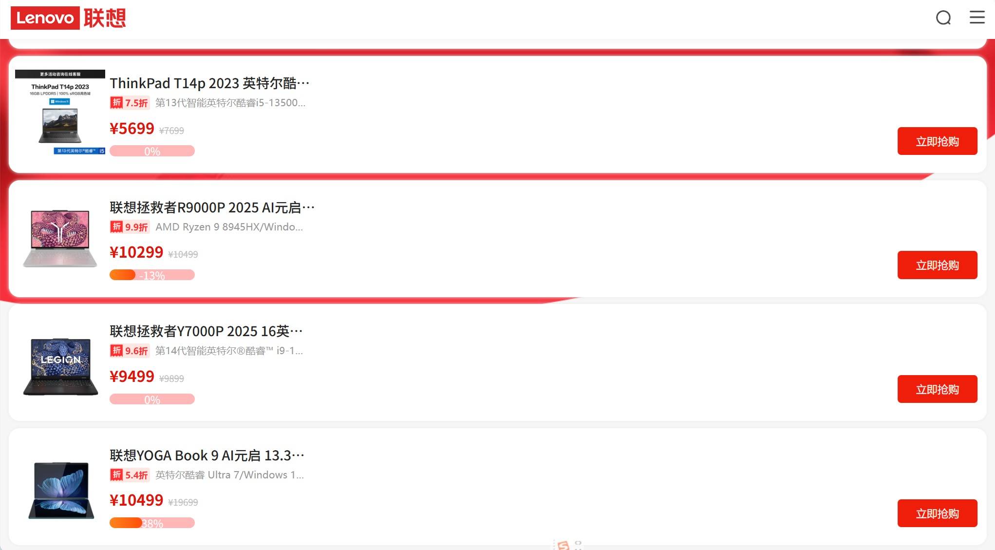 记者在联想官网上看到,联想YOGA Book 9 AI元启 13.3英寸双屏电脑的售价比当初上市时的指导价低了9200元,降价幅度达到5.4折。联想最新款的Y9000P系列笔记本产品在京东平台上的到手价也有一千多元的优惠。