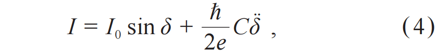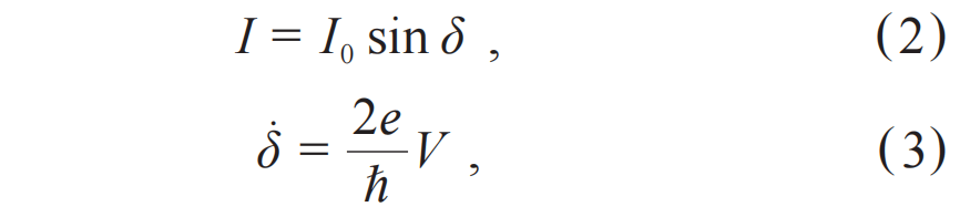 其中I0代表约瑟夫森结的临界电流,若穿过结的电流超过I0,会使结变为一个普通电阻,不再满足约瑟夫森关系。公式(2)是直流方程,将穿过结的电流I与宏观相位δ联系起来;公式(3)是交流方程,根据结两端的电压V给出了δ的时间演化。