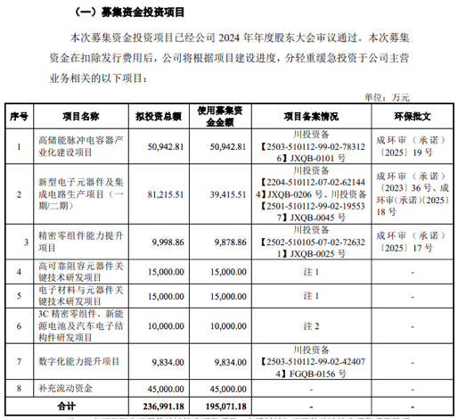 此次IPO,宏明电子拟募资19.51亿元,用于3个产业化项目,即高储能脉冲电容器产业化建设项目、新型电子元器件及集成电路生产项目(一期/二期)、精密零组件能力提升项目;3个研发项目,即高可靠阻容元器件关键技术研发项目、电子材料与元器件关键技术研发项目和3C精密零组件、新能源电池及汽车电子结构件研发项目;以及1个信息化建设项目,即数字化能力提升项目;并补充流动资金。