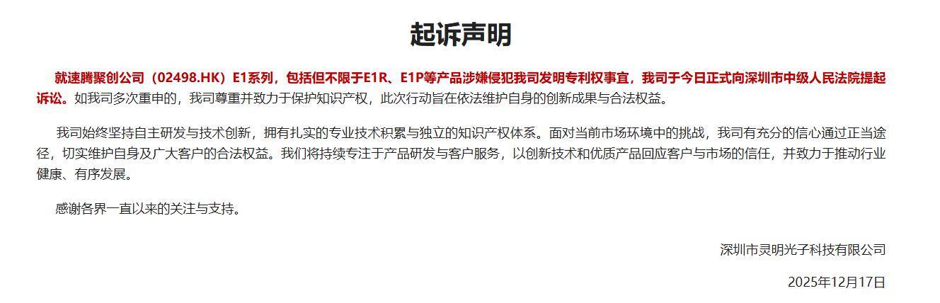 12月17日,深圳市灵明光子科技有限公司(简称“灵明光子”)通过其官方网站发布《起诉声明》称,就速腾聚创(02498.HK)E1系列,包括但不限于E1R、E1P等产品涉嫌侵犯我司发明专利权事宜,我司于今日正式向深圳市中级人民法院提起诉讼。声明称,此次行动旨在依法维护自身的创新成果与合法权益。