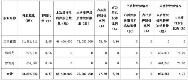 公告显示,江西鑫盛本次股份质押融资用于质押股份置换,不存在负担重大资产重组等业绩补偿。截至公告披露日,上述股东与一致行动人所持质押股份情况如下: