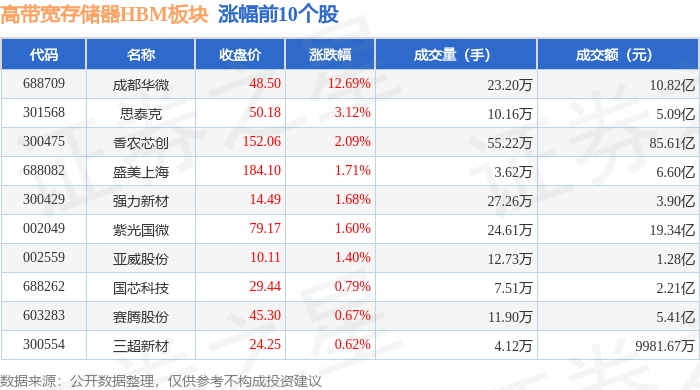 证券之星消息,12月25日高带宽存储器HBM板块较上一交易日上涨0.06%,成都华微领涨。当日上证指数报收于3959.62,上涨0.47%。深证成指报收于13531.41,上涨0.33%。高带宽存储器HBM板块个股涨跌见下表: