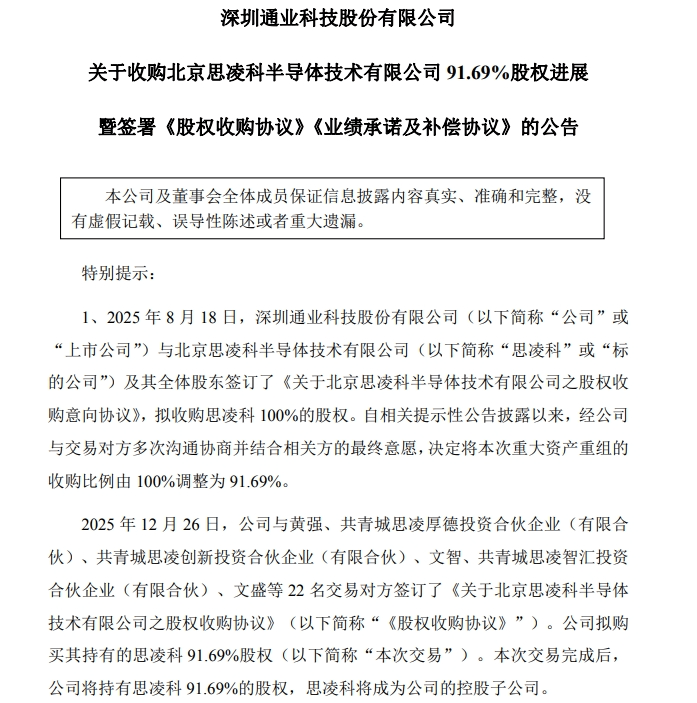 12月28日晚间,通业科技发布重大资产购买暨关联交易报告书(草案)。公司拟收购北京思凌科半导体技术有限公司91.69%股权,本次交易价格约为5.61亿元。同时,公司控股股东、实际控制人及其一致行动人拟向思凌科实际控制人控制的企业转让公司6%股份。交易后,思凌科将成为公司的控股子公司。本次交易构成重大资产重组。