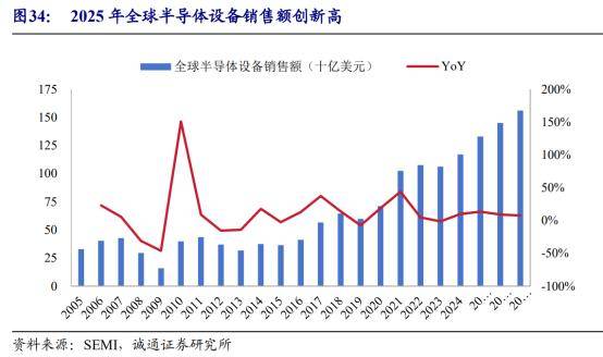近年来全球半导体设备市场规模不断增长。根据国际半导体产业协会(SEMI),2025年全球半导体制造设备总销售额预计达1330亿美元,同比增长13.7%,创历史新高;且增长态势有望持续至未来两年,预计2026年全球半导体设备销售额将达1450亿美元,2027年将攀升至1560亿美元。