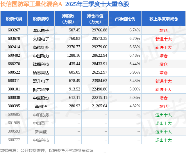 长信国防军工量化混合A的前十大重仓股如下: