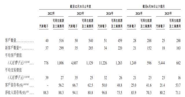 同时,不同领域的客户留存率表现分化。报告期内,公司可再生能源及工业应用领域的客户留存率分别为56.2%、62.5%、48.8%及53.7%,波动中下滑。2023年至2024年,汽车电子领域客户留存率从66.7%下滑至50%,到今年上半年再度下降至21.4%。