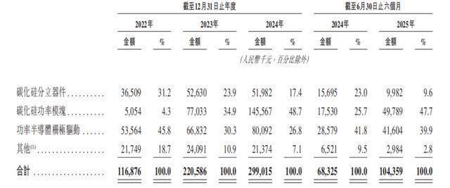 产品结构方面,碳化硅功率模块逐渐成为基本半导体的主导业务,收入从2022年的505.4万元增至2024年的1.46亿元,收入占比也由4.3%大幅增至48.7%,2025年上半年为47.7%。
