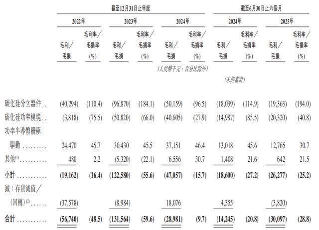 报告期内,基本半导体产生毛损分别为5674万元、1.32亿元、2898.1万元及3009.7万元,公司综合毛损率分别为48.5%、59.6%、9.7%及28.8%。