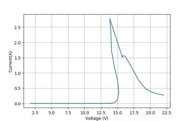 下图是电容的漏电电流变化情况,标称为16V耐压的电解电容,在测试过程中,当电压超过15V之后,电容的漏电便开始急剧上升了。