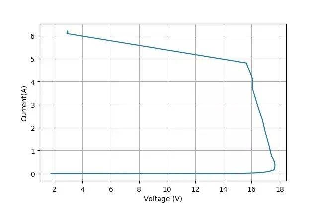 下图显示了在同样的过程中,流过电容的电流变化。可以看到,电流的增加是造成内部温度上升的主要原因。在这个过程中,电压是成线性增加,随着电流急剧升高,供电电源内组使得电压下降。最终,当电流超过6A之后,随着一声巨响,电容炸开。