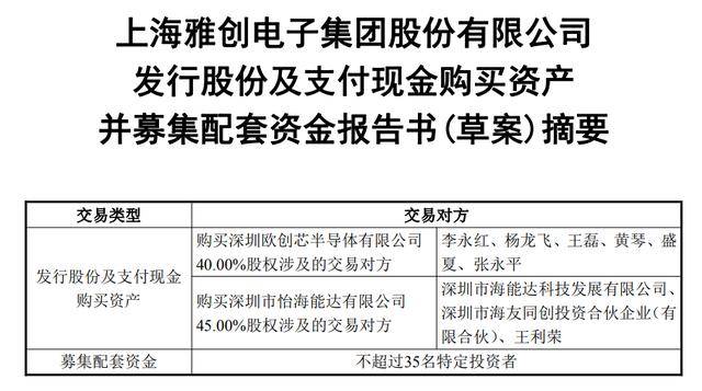 雅创电子(301099)12月31日晚间发布发行股份及支付现金购买资产并募集配套资金报告书(草案)摘要(以下简称摘要)。摘要显示,公司拟购买深圳欧创芯半导体有限公司(以下简称欧创芯)40%股权和深圳市怡海能达有限公司(以下简称怡海能达)45%股权并募集配套资金。本次交易完成后,欧创芯和怡海能达将成为上市公司全资子公司。
