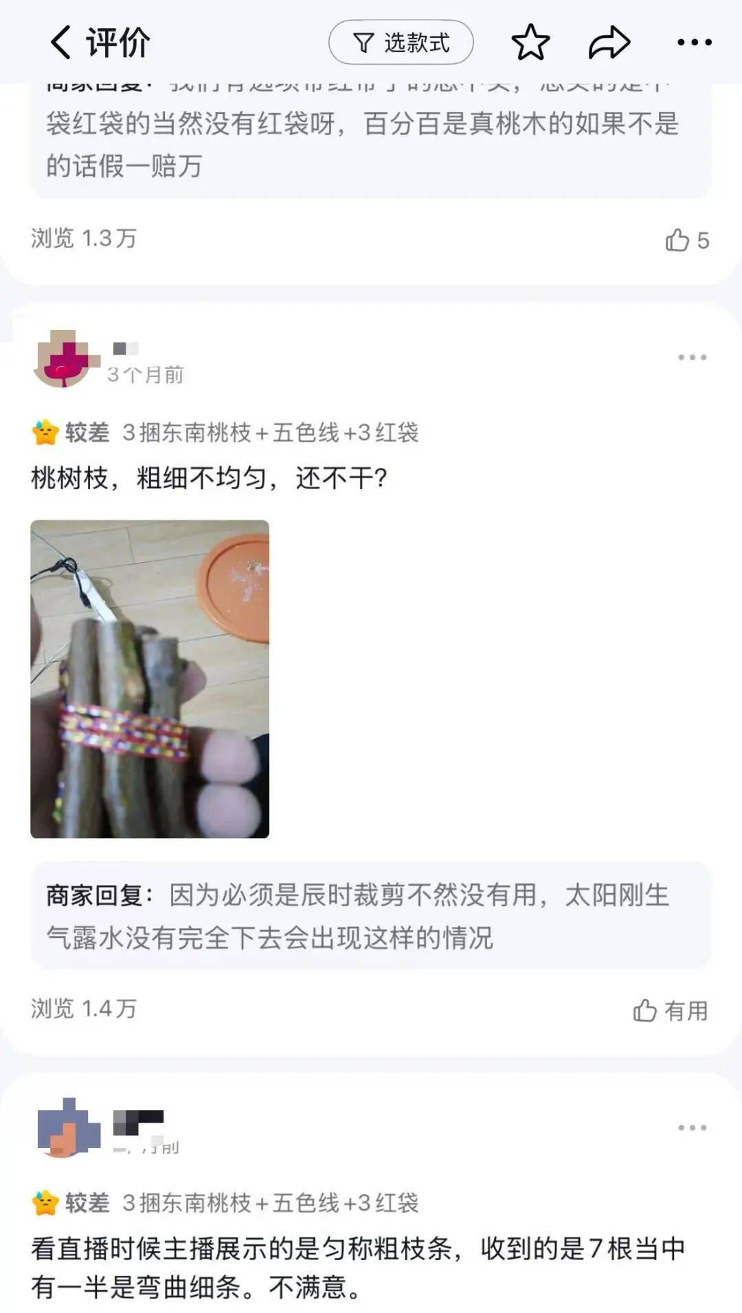 而在博主主页购物橱窗中,售卖的商品也是褒贬不一,有的消费者表示收到的商品很好,而有的却吐槽:“做工太次”“收到的桃木发霉了”等等。