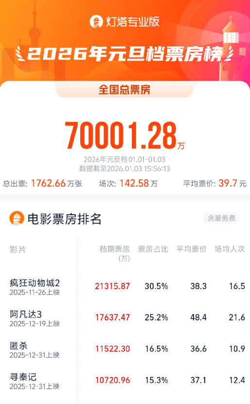 据灯塔专业版,截止 1 月 3 日 15 时 56 分,2026 年元旦档(1 月 1 日—1 月 3 日)档期票房已突破 7 亿元。