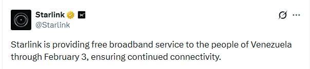 据报道,“星链”在社交媒体上表示,“将为委内瑞拉民众提供免费宽带服务到2月3日,确保网络连接不中断。”