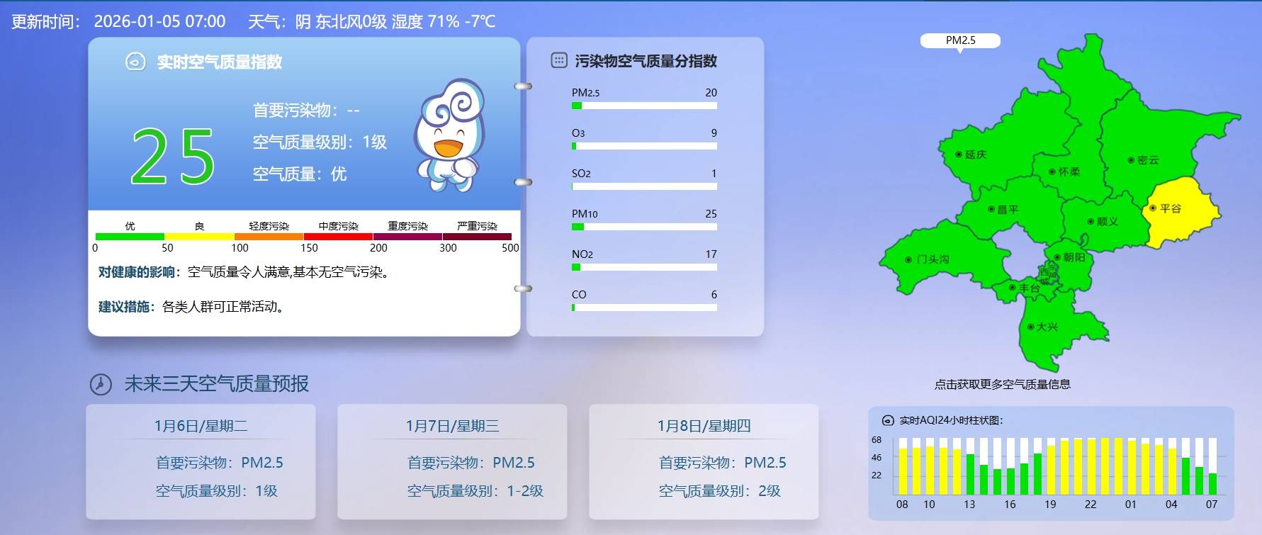 据北京市生态环境监测中心今早7时数据,目前实时空气质量指数25,空气质量优。