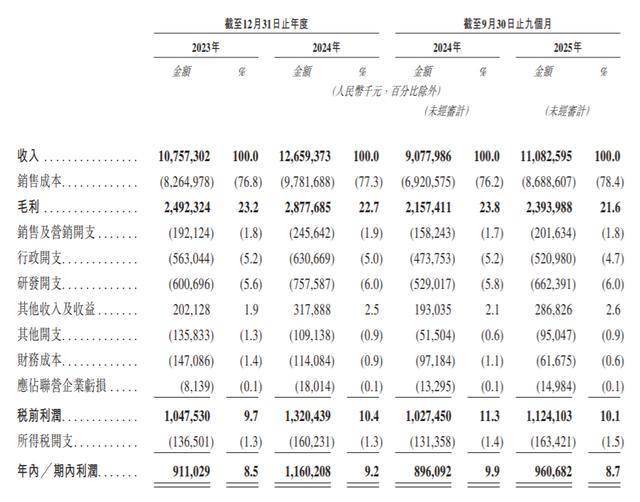 业绩方面,于2023年、2024年及2025年前9个月,景旺电子实现收入分别约为107.57亿元、126.59亿元、110.83亿元;录得利润分别约为9.11亿元、11.6亿元、9.61亿元。