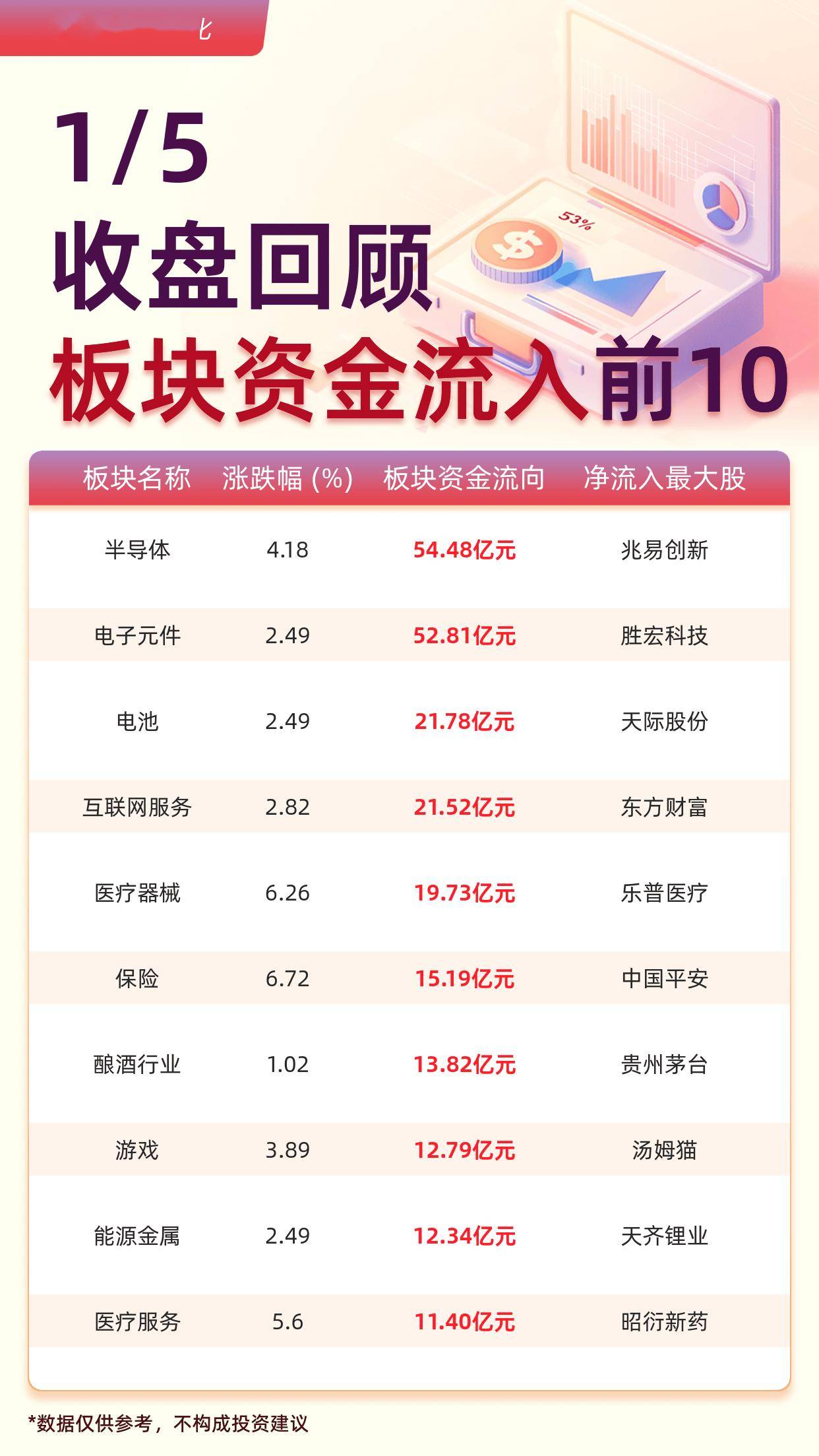 据交易所数据显示,截至1月5日收盘,大盘主力资金净流入40.78亿元。主力资金流入前十大板块分别为: 半导体(54.48亿元)、电子元件(52.81亿元)、电池(21.78亿元)、互联网服务(21.52亿元)、 医疗器械(19.73亿元)、 保险(15.19亿元)、 酿酒行业(13.82亿元)、 游戏(12.79亿元)、 能源金属(12.34亿元)、 医疗服务(11.40亿元)。