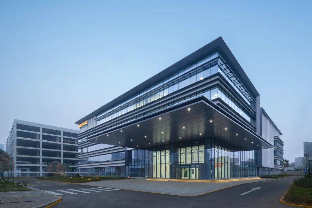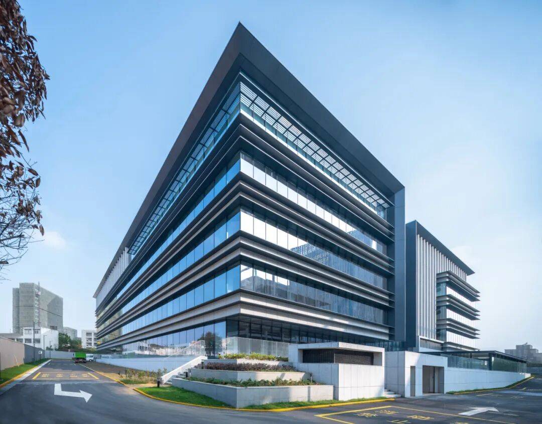 走近建筑,外立面的语言独具匠心。不同朝向搭配了不同的遮阳构件——南面横向板条舒展,东西两侧则增加了纵向元素。这些纵横交错的设计,宛如芯片表面精密的电路,不仅形成了富有辨识度的建筑表情,也巧妙回应了企业自身的产品脉络。