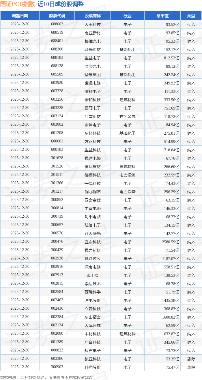 近10日内国证PCB(980115)指数成份股做了调整,新纳入了40只股票,剔除了2只股票。