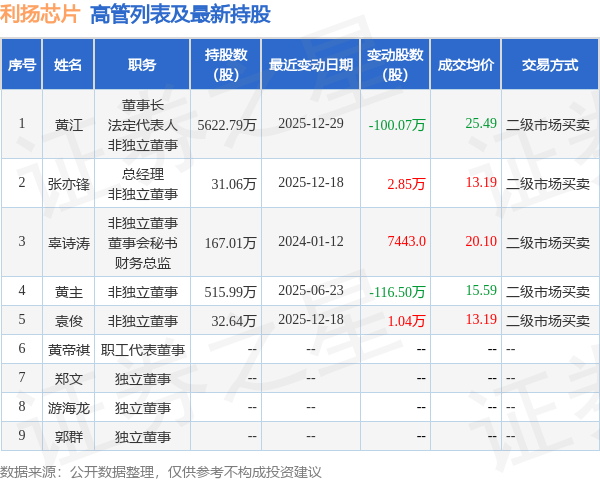 利扬芯片的高管列表及最新持股情况如下:
