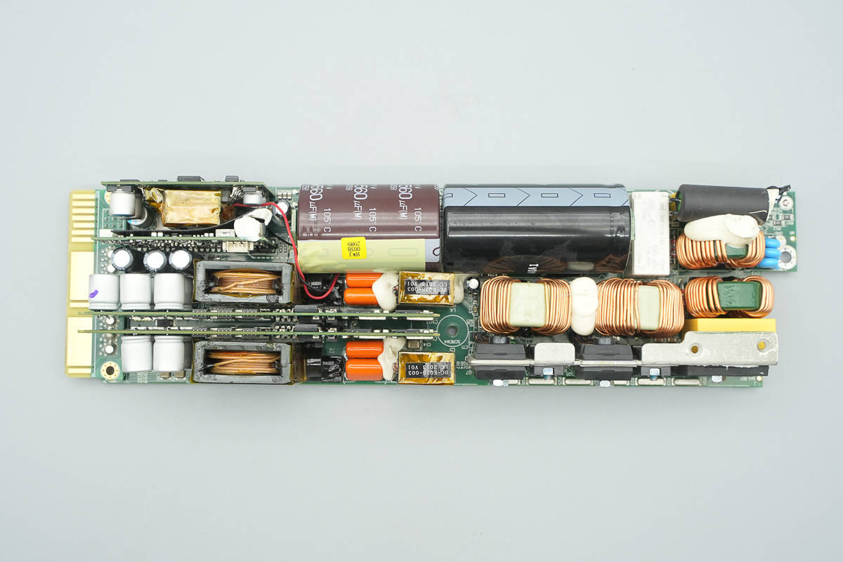 左侧上方设有待机电源小板和LLC控制小板,下方设有变压器,谐振电容,谐振电感,在两组变压器之间设有两块开关管小板。小板焊接LLC开关管和同步整流管。