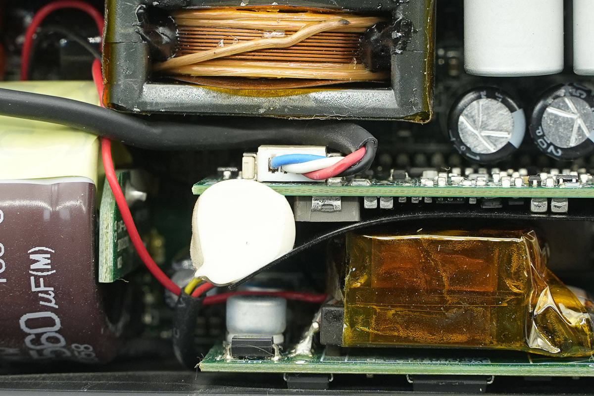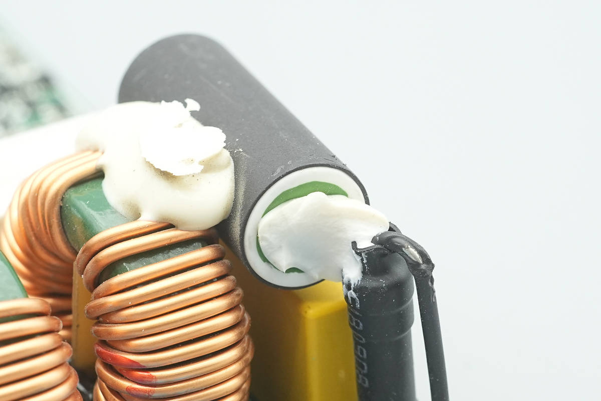 LLC开关管和同步整流管来自英飞凌,使用IPL60R075CFD7搭配BSC070N10NS3G。待机电源使用英飞凌ICE5QR0680AG,同步整流控制器采用芯源系统MP6902。电源内部采用日系贵弥功和红宝石品牌电容滤波。电源采用多块PCB焊接组成,帮助空气流通,提升散热效果并充分利用空间,做工用料扎实可靠。