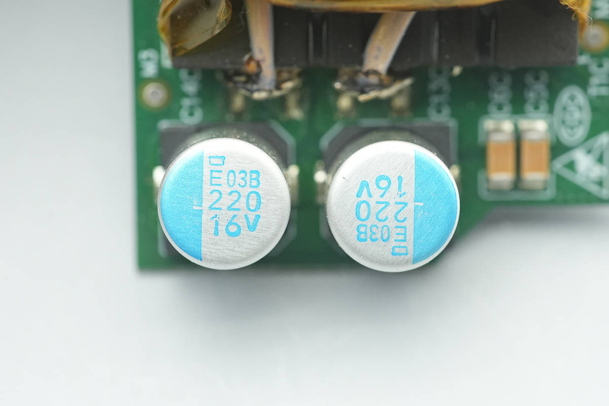 两颗滤波电容来自贵弥功,为PXE系列导电性高分子固体铝电解电容,具备15000小时寿命,规格为220μF16V。