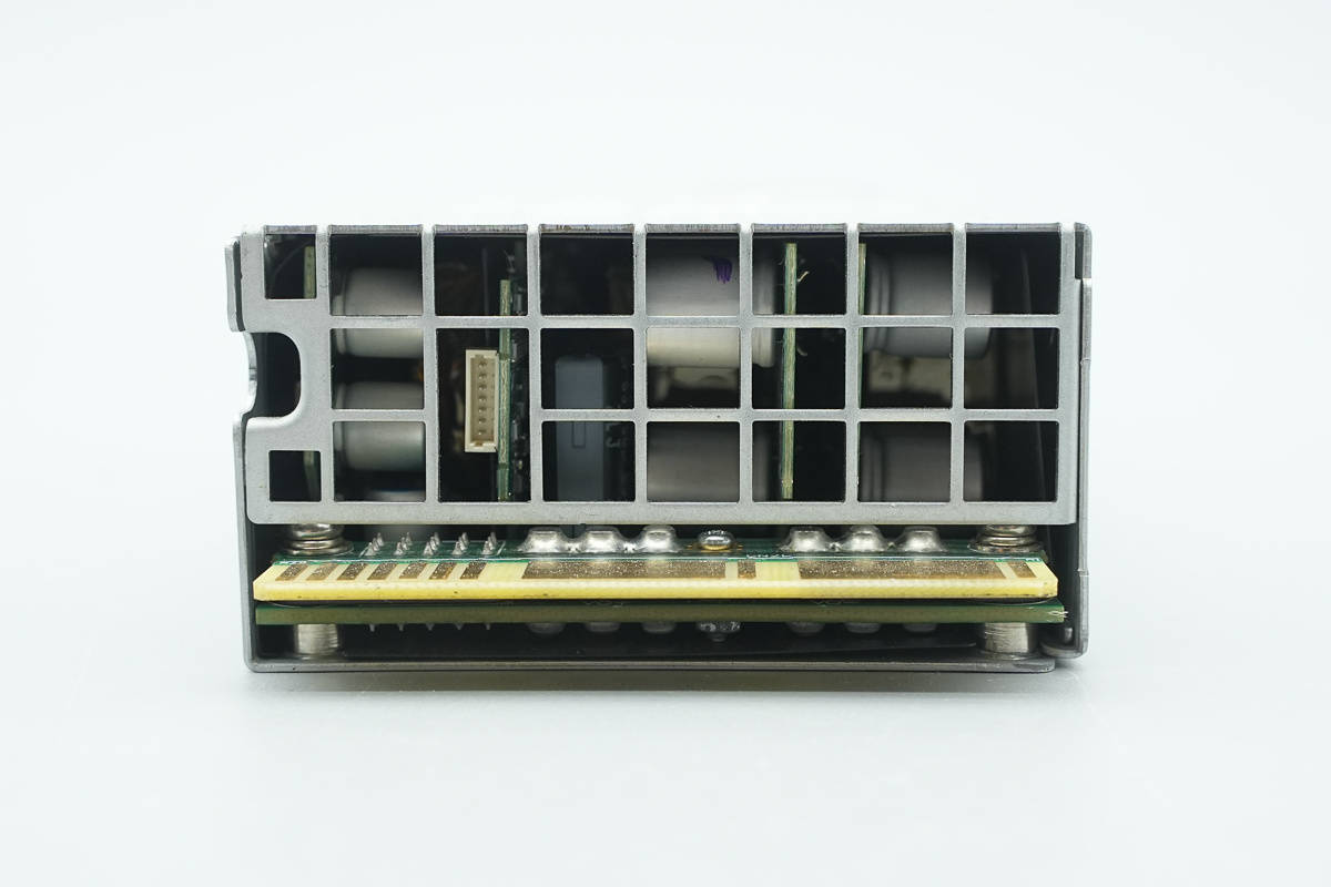电源模块输出端设有格栅和金手指小板,透过格栅可以看到内部设有小板和滤波固态电容。