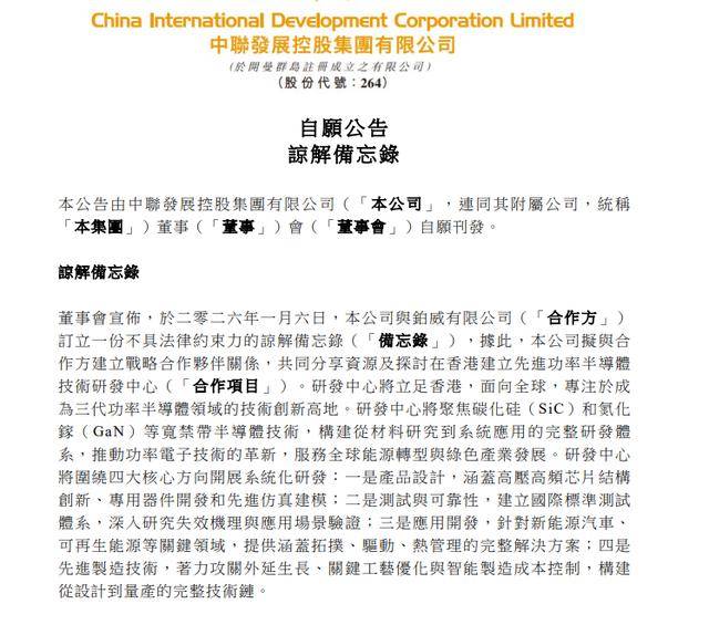 中联发展控股与铂威有限公司于2026年1月6日签署战略合作谅解备忘录,计划在港共建先进功率半导体技术研发中心,专注于宽禁带半导体技术,如碳化硅和氮化镓,以推动功率电子技术革新和全球能源转型。