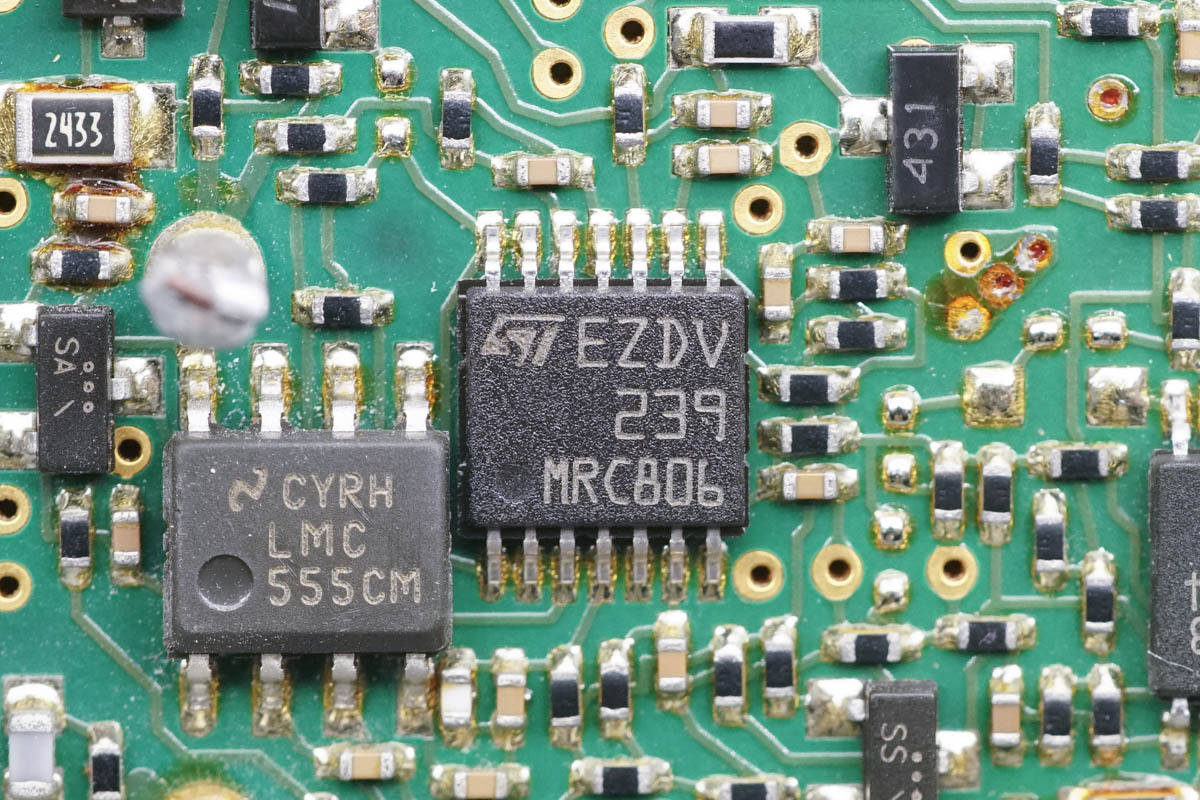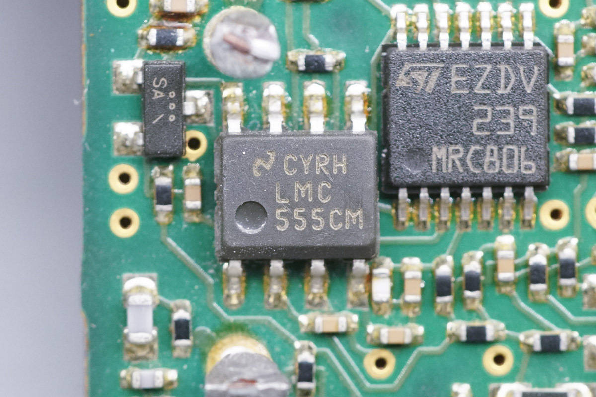 一颗555计数器来自德州仪器,实际型号为LMC555,该器件器件是业界标准555系列通用计时器的 CMOS 版本。LMC555具有与LM555相同的产生精确时延和频率的能力,但功耗和电源电流尖峰要低得多。在一次性模式下,时延由单个外部电阻器和电容器精确控制。在非稳态模式下,振荡频率和占空比由两个外部电阻器和一个电容器精确设置。