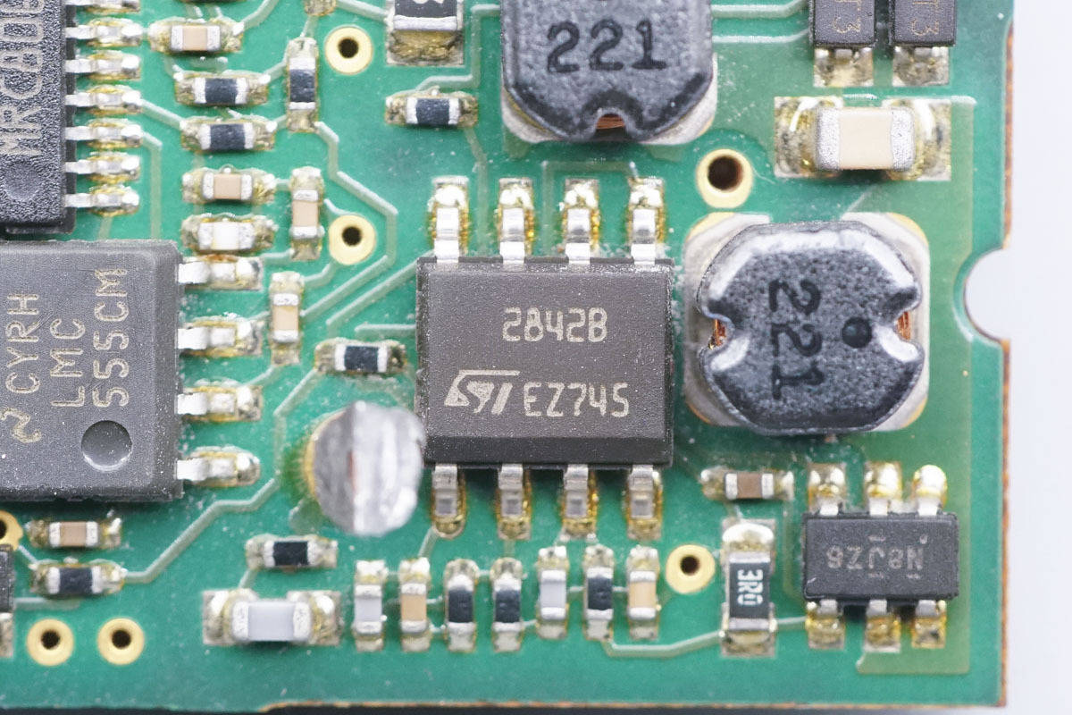 丝印2842B的芯片来自意法,实际型号为UC2842B,该芯片是一颗电流模式PWM芯片,具备实现离线或DC-DC固定频率电流模式控制方案所需的核心功能,且外部元件用量极少。其内部集成电路包含:经过微调可实现精确占空比控制的振荡器、具有启动电流低于0.5mA特性的欠压锁定电路、误差放大器输入端精度校准的基准电压源、确保锁存运行的逻辑电路、兼具限流功能的PWM比较器,以及专为高峰值电流推送/吸纳能力设计的图腾柱输出级。该输出级适用于驱动N沟道MOSFET,在关断状态下保持低电平,采用SO8封装。